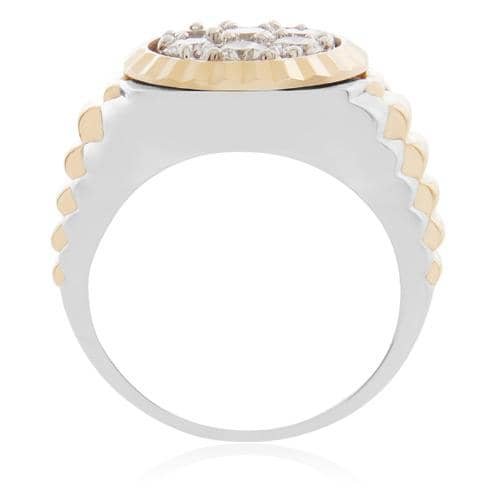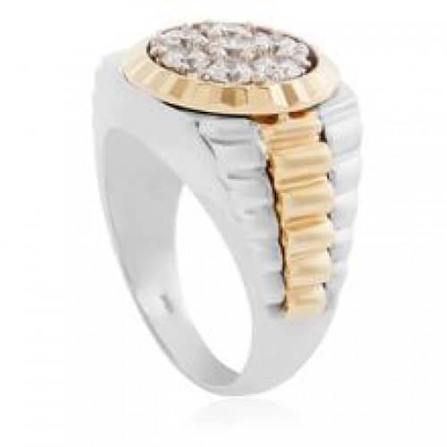 The ring boasts a captivating two-tone design, with a combination of white and yellow gold. This dual-tone effect not only adds a contemporary twist to the classic ring but also enhances the overall visual appeal, making it a standout accessory.
