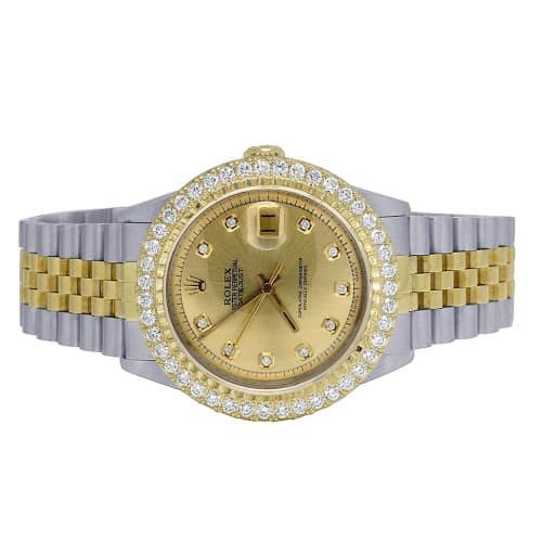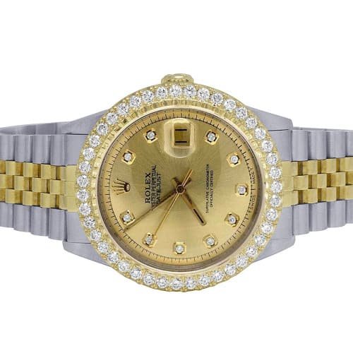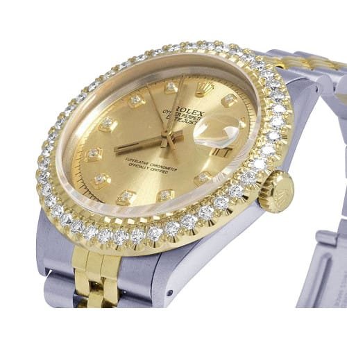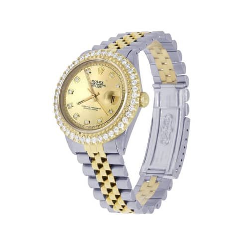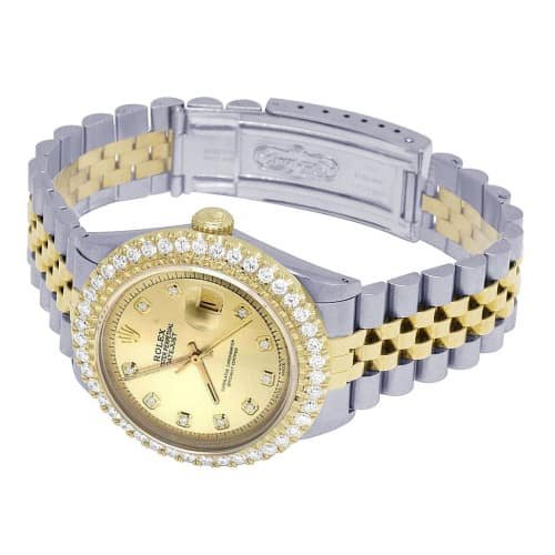 Indulge in timeless sophistication with the Rolex Datejust. This 36MM masterpiece showcases a classic Champagne Dial and is adorned with a subtle 3.0 Ct of diamonds. Crafted with precision from 18K yellow gold and steel, it’s a symbol of refined elegance.