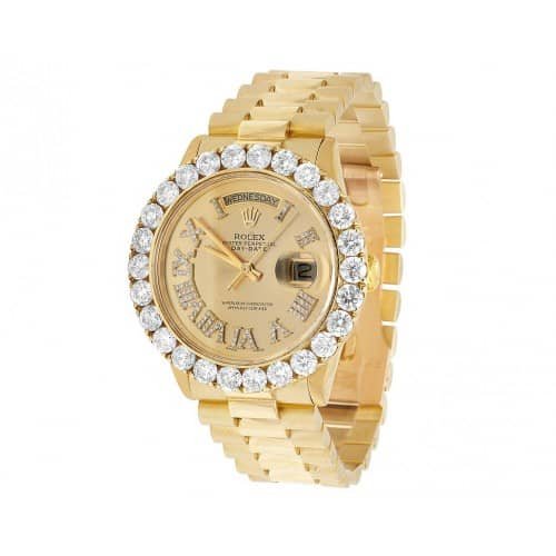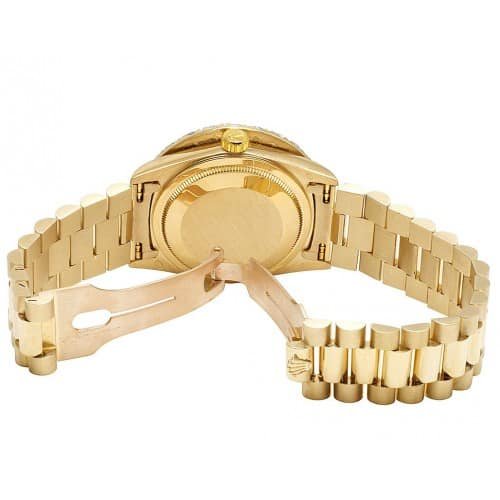 The Rolex Day-Date 18k Gold Diamond Watch features solid 18k gold construction for lasting quality and brilliance.